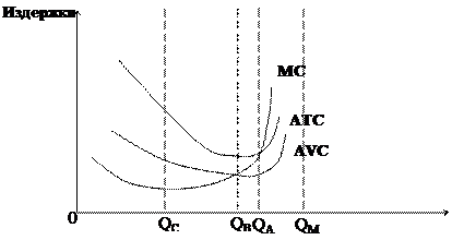 Рисунок 10 - Динамика издержек при изменении объема производства Затраты других видов не зависят от объемов производства, например зарплата администрации предприятия, охраны, плата за арендованные основные средства и т. п. Так как они непосредственно не влияют на решение о том, в каких количествах осуществлять производство, а просто являются условием, предпосылкой функционирования предприятия, их принято называть затратами, не определяющими решения. Однако будет неверным считать, что все переменные издержки влияют на решение об объемах производства, а все постоянные - нет. Существует большое количество издержек, которые в определенной ситуации по принятию решения выступают переменными, а в другой ситуации могут быть постоянными. Факторами, определяющими характер издержек, являются: • длительность периода; • характер ситуации, которая рассматривается, и пр. Под длительным периодом принято считать период, когда все производственные факторы могут быть изменены, краткосрочным периодом - период, когда возможно изменение лишь части факторов производства. В длительном периоде все издержки становятся переменными. Зарплата рабочих, являясь переменными издержками, при увольнении рабочих в течение времени, определенного законодательством, становится издержками постоянными. Для предпринимателя важной является информация о том, каковы не просто его издержки, а издержки по выпуску единицы продукции, т.е. средние издержки. Средние издержки (АТС) - это валовые издержки, приходящиеся на единицу выпускаемой продукции: АТС = Соответственно рассчитываются средние постоянные и средние переменные издержки: AFC = Графически вид кривых AFC, AVC, АТС представлен на рис. 11. Расстояние между линиями средних общих и средних переменных издержек равно средним постоянным издержкам. Средние переменные издержки, как видно из графика, вначале падают, достигают своего минимума, а затем начинают расти. Практически это означает, что при малом объеме производства процесс будет относительно неэффективным и дорогостоящим, так как оборудование окажется недогруженным, разделение труда - неглубоким, технологические процессы - менее совершенными.