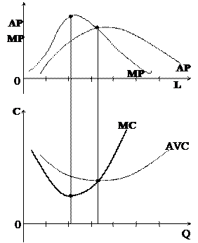 Рисунок 12 - Взаимосвязь динамики среднего и предельного продуктов и средних и предельных издержек