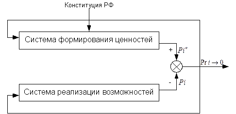 На схеме прняты следующие обозначения: по каждому i -ому измерению ситуации может быть сформирована проблема Pri=Pi*-Pi →0, где Pi* – показатель i -ого вида нормы или стандарта на i -ую категорию имущества или отношений, Pi – действительное значение показателя i -ой нормы. Pi*=Ki∙Xi , Pi=Li∙Yi , где Ki – норма, стандарт, уровень социальной гарантии в расчете на одного потребителя, Xi – прогнозная численность получателей i-ого социального блага, Li – фактическая норма распределения благ i -ого вида, Yi – фактическое число потребителей благ. Ki=f1(Rkm), Li=f2(Rln), где Rkm – законодательно-административные ресурсы, Rln – материальные ресурсы в распоряжении лиц, принимающих решения. При построении простейшей модели обусловленности проблемы (ценности – возможности) определяют связь обоих видов ресурсов с проблемой (их важность, которая оценивается экспертами и по результатам опыта, например, в виде диаграммы Парето, и коэффициент тесноты связи – коэффициента корреляции – между ресурсами и проблемой определяют из данных социально-экономического мониторинга).