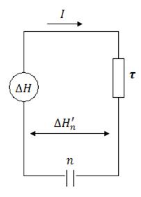 Изобразим цепь заполнения памяти с ёмкостью n от источника информации с напряжением В непрерывных системах 𝝉 – это время заполнения минимально различимой доли памяти.