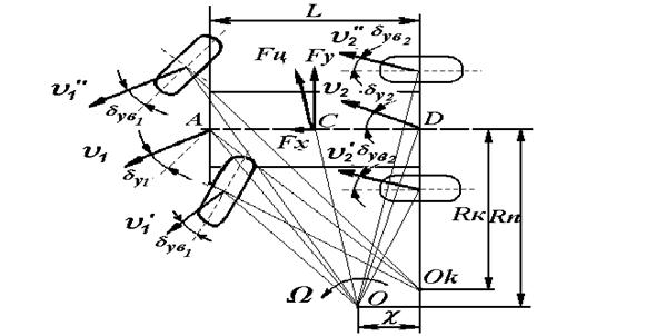 Рис. 11 С достаточной точностью можно считать, что коэффициент сопротивления боковому уводу остается постоянным или мало меняется при углах увода до 80 –100 . Коэффициент сопротивления уводу зависит от давления воздуха в шине, нормальной нагрузки на колесо, окружного усилия и конструкции шин. Значения коэффициента для шин легковых автомобилей 15…40 кН/рад; для шин грузовых автомобилей 60…120 кН/рад. 3.2. Кинематика поворота автомобиля с учетом бокового увода колес Рассмотрим схему поворота автомобиля с учетом бокового увода колес (рис. 12)