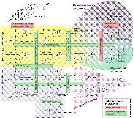 Гипофункция Патология Механизм действия АКТГ стимулирует секрецию глюкокортикоидов пучковой зоны коры надпочечников. Гормон связывается с семидоменными рецепторами на поверхности клеток, связанными с G-белками. При этом происходит изменение их конформации и стимуляция фермента аденилатциклазы. Рост уровня внутриклеточного цАМФ в свою очередь активирует протеин киназу А. АКТГ имеет две формы активации быструю короткую (в течении минут) и медленную длительную (в течении нескольких часов): · Короткая форма включает процесс поступления холестерола в митохондрии, где расположен фермент Р450scc, который катализирует первую реакцию стероидогенеза – отщепление боковой цепи холестерола. АКТГ стимулирует также захват кортикальными клетками липопротеинов, что обеспечивает биодоступность холестерола клетками коры надпочечников. · Длительная форма включает стимуляцию экспрессии: o Генов, кодирующих ферменты стероидогенеза, особенно P450scc, 11β-гидроксилазу и связанные с ними электрон переносящие белки. o митохондриальных генов, ответственных за субъединицы цепи переноса электронов. Это необходимо для энергетического обеспечения процесса.