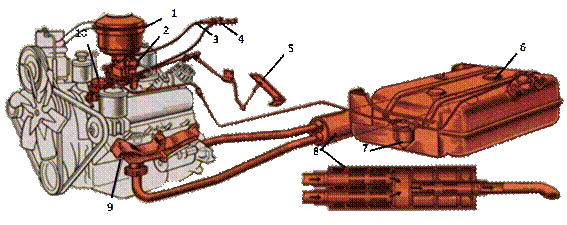 Рис. 4. Состав системы питания карбюраторного двигателя: (СЛАЙД № 9). 1 - воздушный фильтр; 2 - карбюратор; 3-4-5 - средства управления системой питания; 6 - топливные баки; 7 - фильтр-отстойник; 8 - глушитель; 9 - выпускные коллекторы – 2шт.; 10 - топливный насос.