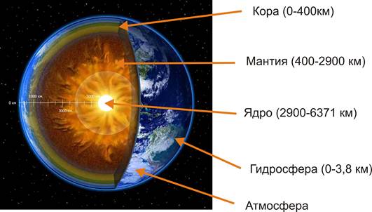 Рис. 1.1. Геосферы Земли (http-www.home.edu.ru) Но не менее важно и одно из ее теоретических значений - создание важнейших обобщений относительно эволюции вещества Земли в связи с эволюцией атомов в космосфере[1]. Ведь химический состав нашей планеты - это своеобразное отражение давно протекавших космических процессов, в том числе образования химических элементов в звездах. Геохимическая история атомов на Земле тесно связана с их историей космической, которую изучает наука космохимия. Новые геофизические данные, а также данные по физике высоких давлений свидетельствуют о различном химическом составе основных оболочек Земли - коре, мантии и ядре (рис. 1.1). В настоящее время геохимия заняла ведущее место среди наук о Земле. Она изучает глобальные перемещения вещества и энергии во времени и пространстве. Сбылось предсказание В.И. Вернадского, о центральной роли геохимии среди наук о веществе. Объектами геохимии теперь являются: литосфера, гидросфера, биосфера, атмосфера и космосфера. Все наружные оболочки земли (рис.1.2) и космосфера.