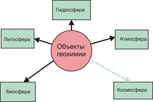 Как самостоятельная наука геохимия была создана: В.И. Вернадским, Ф.У. Кларком, А.Е. Ферсманом, В.М. Гольдшмидтом, А.П. Виноградовым и др. Выдающийся русский и советский ученый В. И. Вернадский по праву считается одним из основателей современной геохимии. В 1927 г. он так расшифровал ее содержание: “Геохимия научно изучает химические элементы, т.е. атомы земной коры и, насколько возможно, всей планеты. Она изучает их историю, их распределение и движение в пространстве-времени, их генетические на, нашей планете соотношения”. Близкие по существу определения дают А.Е.Ферсман, В.М.Гольдшмидт, А.А.Сауков, В.В.Щеребина, А.И Перельман и др. Эти определения отличаются лишь тем или иным акцентом, связанным со специализацией и интересами авторов. По А. Е.Ферсману (1932), «геохимия изучает историю химических элементов - атомов в земной коре и их поведение при различных термодинамических и физико-химических условиях природы». По В. М. Гольдшмидту (1954 г.), «геохимия изучает распределение и содержание химических элементов в минералах, рудах, породах, почвах, водах и атмосферную циркуляцию элементов в природе на основе свойств атомов и ионов». Определение содержания геохимии как науки об истории земных атомов не только предполагает обязательное решение такой важной задачи, как изучение распределения элементов в различных природных объектах, но и подключает геохимию к главной задаче всех наук о Земле - выяснению происхождения и истории развития нашей планеты и законов этого развития. Таким образом, современная геохимия изучает историю атомов химических элементов Земли. Современная геохимия – наука, изучающая историю химических элементов Земли, как и новая ее ветвь-космохимия, рассматривает миграцию химических элементов в пределах космоса. Таким образом, границы геохимии беспредельны. Одна из важнейших задач геохимии — определение распространенности химических элементов в земной коре. С этих исследований во многом и началась геохимия как наука. Важнейшими задачами геохимии по А.А. Саукову являются: 1. Выявление закономерностей распределения отдельных химических элементов в различных оболочках Земли, выяснение качественного и количественного состава геосфер и причин, определяющих различную распространенность элементов. 2. Выяснение закономерностей миграции химических элементов в земной коре и причин неравномерного распределения их в различных участках земной коры. 3. Определение закономерностей в распределении элементов между отдельными геологическими системами в связи с их возрастом, тектоникой, составом и др. 4. Изучение поведения того или иного атома при различных термодинамических условиях и на различных стадиях ее космической и геологической истории. В современном понимании геохимия является наукой о распространенности, процессах миграции - концентрации и рассеивания химических элементов и их стабильных изотопов в разных геологических объектах - оболочки Земли, породы, осадки, почва, поверхностные и подземные воды (рис. 1.1).