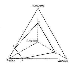 Рис. 7.6. Приближенная диаграмма системы альбит — анортит — гиперстен — диопсид (линия X — Е соответствует линии X — Е на рис. 7.6). На рис. 7.6 изображена тройная система альбит-анортит-диопсид с нанесенными изотермами и линией X-Е — котектической кривой, разделяющей области кристаллизации плагиоклаза и диопсида. Если исходный состав расплава отвечал точке А (с заведомо высоким содержанием анортита), то с понижением температуры в нем будет выделяться плагиоклаз, по составу отвечающий точке F, а состав расплава будет изменяться по направлению к точке Вдо пересечения с котектикой. После этого начнет выпадать и диопсид, и расплав будет изменяться вдоль линии котектики по направлению к точке X. Рассмотренная диаграмма представляет собой одну из проекций диаграммы смеси из четырех компонентов (рис. 7.7) — альбита, анортита, диопсида и гиперстена, являющейся схематичным прообразом базальта. Вписанная в тетраэдр кривая поверхность с нижним основанием X- Е представляет собой котектическую поверхность. Кристаллизация вещества, состоящего из этих четырех компонентов, подчиняется ранее изложенным правилам. Нужно отметить следующее: если исходный состав магмы был кислым, то кристаллизация начнется с плагиоклаза и состав расплава будет перемещаться в направлении к котектике так, как показано на рис. 7.6. Если же исходный расплав будет более обогащен Fe—Mg-силикатами, то кристаллизация начнется с пироксена и закончится также на котектической поверхности. В заключение следует сказать, что эвтектики управляют кристаллизацией расплава. Контрольные вопросы: Дайте определение термина миграция. Виды сред миграции. Как называется отношение заряда иона к его ионному радиусу? Есть ли четкая граница между истинными и коллоидными растворами? Виды факторов миграции? Что является результатом миграции? Между какими параметрами устанавливает связь правило Вилларда Гиббса (правило фаз)? 8. ПОКАЗАТЕЛИ МИГРАЦИИ ХИМИЧЕСКИХ ЭЛЕМЕНТОВ