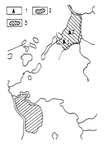 Рис.17.12. Схема антропогенных нарушений Ванкорской площади 1- скважины №1 и 2, 2 - участок с выгоревшим моховым покровом, 3- тоже, покрытый песчано-глинистыми выбросами из аварийной скважины.