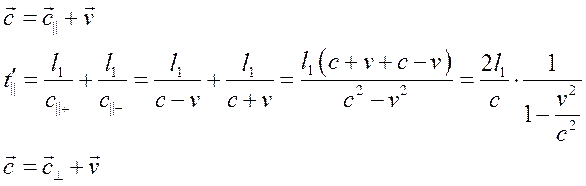 Пластинка B полупрозрачна. На ней луч разделяется на два когерентных перпендикулярных луча, идущих к зеркалам D и C. В интерферометре встречаются два когерентных луча, прошедших от места разделения различные пути. Если эти пути пройдены ими за одинаковое время, то в точку встречи они придут в одной фазе и усилят друг друга. Если за разное время, то в точке встречи разность фаз и колебаний изменится. Наблюдая интерференцию, можно сделать вывод о разности фаз пришедших в интерферометр когерентных волн, а отсюда вычислить время запаздывания одной волны относительно другой. Это и было сделано Майкельсоном и Морли. Это был один из самых замечательных экспериментов 19 столетия. Простой по существу, этот опыт привел к революции в науке. Пусть прибор движется в направлении плеча BC со скоростью v относительно эфира. Скорость света относительно эфира c. Полное время, в течении которого будет пройден путь до зеркала C и обратно, будет равно: