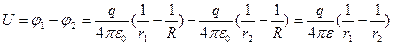 При Рис.2.15. Внутри шара φ(r ≤ 0) = φ0 = 0. Разность потенциалов U (рис.2.16) двух точек на силовой линии электрического поля заряженного шара определяется по формуле: