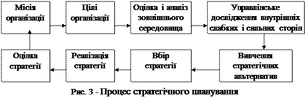 Місія — це дуже загальна мета, що викликає в кожного члена організації, зокрема, і в усіх їх разом почуття спрямованості до чогось. Місія у класичному вигляді повинна декларувати: • роль, яку підприємство хоче відігравати в суспільстві; • базові цілі, які вона ставить в комерційній діяльності перед собою; • кодекс поводження співробітників. Таким чином, можна сказати, що місія — причина існування і функціонування підприємства, що розглядається. Місія виконує роль направляючого орієнтира в процесі розвитку підприємства. Визначення місії є початковим етапом розробки стратегічного плану. Як бачимо з наведеної на рис. 3 схеми, ідеальні цілі (місія) повинні доповнюватися цілями, що підлягають виконанню в плановому періоді. Цілі підприємства формуються тими, хто розпоряджається ключовими ресурсами підприємства, тому система ціннісних орієнтирів вищого керівництва деякою мірою впливає на вибір цілей. З цього погляду наявність місії вкрай необхідна для зниження впливу суб'єктивного фактора. Подальшим етапом розробки плану є аналіз зовнішнього і внутрішнього середовища. Оцінка слабких і сильних сторін підприємства (аналіз внутрішнього середовища) повинна дати змогу оцінити ступінь готовності підприємства задовольняти вимогам зовнішнього середовища в майбутньому, можливі шляхи удосконалення діяльності. При цьому аналіз ведеться у таких функціональних напрямках: виробництво, кадри, організація постачання, маркетинг і т. ін. Наступним етапом є розгляд можливих стратегічних альтернатив. Розрізняють такі види стратегічних альтернатив: швидке зростання; обмежене зростання; скорочення; у великих підприємствах можуть мати місце всі три види альтернатив. Нестабільність умов господарювання в ринковій економіці (особливо у віддаленій перспективі) потребує використання різноманітних підходів до розробки стратегічних планів. Альтернативність привноситься у процес планування на стадії розробки планів шляхом пророблення трьох сценаріїв: оптимістичного, песимістичного і найбільш імовірного. Розробивши варіанти планів, керівництво вибирає стратегічну альтернативу розвитку підприємства і починає її реалізовувати на практиці. На цьому етапі показники-орієнтири і завдання, закладені в стратегічні плани, деталізуються у процесі розробки, а потім і реалізації тактичних планів. У міру їхнього виконання у процесі контролю накопичується інформація, що може при необхідності змусити керівництво внести корективи в стратегічний план навіть на першій його стадії. Головна відмінність стратегічного планування від довгострокового - його варіативність, розробка альтернативних версій розвитку майбутнього підприємства. Інші плани мають чіткі часові межі. Довгострокове планування. План як правило, розрахований на строк від 5 до 10 років і передбачає формування перспективних цілей підприємства, а також прийняття рішень, спрямованих на кращі розподіл його ресурсів, на основі довгострокових прогнозів. Цей вид планування має дві важливих підстави: впровадження нововведень й об'єднання інноваційних стратегій підрозділів підприємства. Середньострокове планування. Планрозробляються на строк від 1 року до 5 років (найчастіше 5). У порівнянні з довгостроковими ці плани більш докладні й містять більше число кількісних показників, у них наг