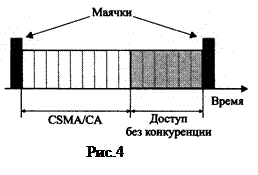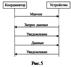 Существует три типа обменных процесса в ZigBee: - передача от устройства к сетевому координатору; - передача от сетевого координатора к устройству; - передача между двумя одноранговыми устройствами. Когда устройство собирается передать данные координатору в сети с маячками, оно сначала пытается обнаружить маячок (рис.5). Когда маячок найден, устройство подстраивается к структуре суперфрейма. Устройство передает данные координатору, используя слотовый механизм CSMA/CA. В ответ координатор отсылает фрейм уведомления о получении. На этом цикл обмена заканчивается.