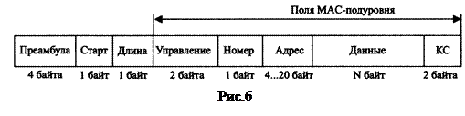 Фрейм данных (рис.6) начинается с преамбулы, которая совместно с полем «Старт» служит для синхронизации данных в приемнике, поле «Длина» содержит длину поля МАС подуровня в 8-битовых байтах. Поле «Управление» содержит служебную информацию об управлении фреймами. Поле «Номер» – порядковый номер данных, поле «Адрес» – адресную информацию, в том числе 16-битный короткий или 64-битный расширенный адрес. Завершается фрейм полем контрольной суммы КС.