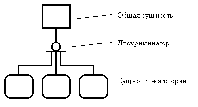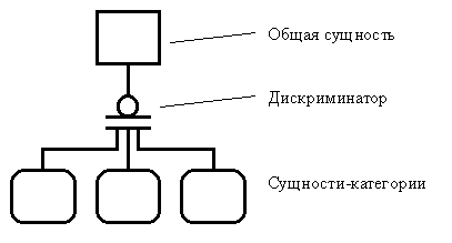 Рисунок 17. Связь полной категории в IDEF1x Также может существовать отношение неполной категоризации (сущности-категории составляют неполное множество потомков общей сущности):