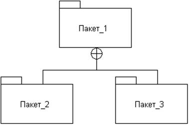 С другой стороны, это же отношение может быть изображено с помощью отрезков линий аналогично графическому представлению дерева. В этом случае наиболее общий пакет (метапакет или контейнер) изображается в верхней части рисунка, а его подпакеты — уровнем ниже. Метапакет соединяется с подпакетами сплошной линией, на конце которой, примыкающей к метапакету, изображается специальный символ © (знак плюс в кружочке). Этот символ означает, что подпакеты являются "собственностью" или частью контейнера, и, кроме этих подпакетов, контейнер не содержит никаких других подпакетов. Рассмотренный выше пример (рис. 27) может быть представлен с помощью явной визуализации отношения включения (рис. 28). На графических диаграммах между пакетами могут указываться и другие типы отношений, часть из которых будут рассмотрены с последующих главах книги.
