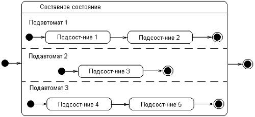 Параллельные подсостояния. Параллельные подсостояния (concurrent substates) позволяют специфицировать два и более подавтомата, которые могут выполняться параллельно внутри составного