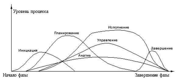 Процессы управления проектами накладываются друг на друга и происходят с разными интенсивностями на всех стадиях проекта, как проиллюстрировано на рисунке.