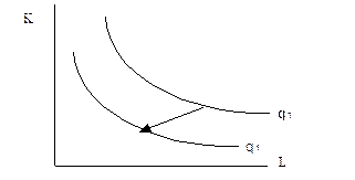 В длительном периоде не только труд, но и капитал является переменным фактором производства. Также переменными являются и производственные технологии, т. е. способы производства. Технический прогресс означает, что тот же объем выпуска можно получить с меньшими затратами труда и капитала. Это означает, что все изокванты сдвигаются вниз к началу координат (рис. 6-6): Рис. 9. Сдвиг изоквант вследствие технического прогресса