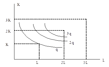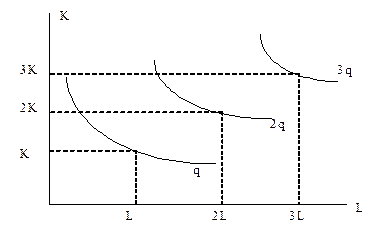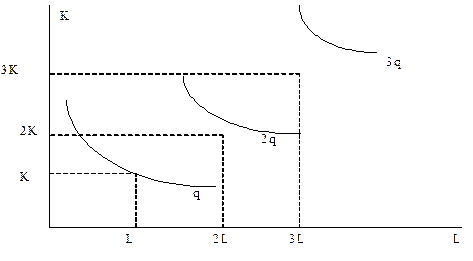 Наконец, при убывающей отдаче от масштаба расстояние между изоквантами увеличивается (рис. 11): Рис. 11. Убывающая отдача от масштаба