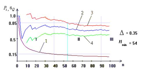 Рисунок 2.3-До визначення обсягу навчальної вибірки: 1- графік функції e Q = f (n); 2-графік емпіричної частоти 3 - верхня межа довірчого інтервалу; 4 - нижня межа довірчого інтервалу