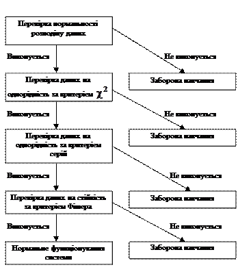 Важливим етапом формування навчальної вибірки є оцінка її статистичної стійкості та однорідності, оскільки ці властивості суттєво впливають на величину повної ймовірності прийняття правильних рішень. Основним способом недопущення зниження достовірності рішень, що приймає система, є блокування її функціонування як в режимах навчання, так і екзамену, якщо не виконуються умови статистичної стійкості або статистичної однорідності вибірок. У загальному випадку ІС блокує режими навчання й екзамену за таких причин: · перехідний процес, що відбувається, наприклад, в задачах керування при зміні функціональних станів технологічного процесу під впливом як керованих, так і некерованих факторів; · відмова технологічного обладнання; · неправильне функціонування датчиків інформації; · неоптимальні значення контрольних і нормованих допусків на ознаки розпізнавання. Як критерії статистичної стійкості використовуються відомі в математичній статистиці вибіркові критерії оцінки параметрів імовірнісних розподілів [45-49]. Як критерії статистичної однорідності доцільно використовувати критерій згоди Пірсона (критерій c 2) [45,48,49], серійний критерій Вальда-Вольфсона [48], критерій Колмогорова-Смірнова (критерій l) [49], критерій серій [48,49] та інші. Як критерії інформативності ознак можуть використовуватися коефіцієнти парної та множинної кореляції [45,47] і прямі статистичні інформаційні критерії [23,43]. Одну із ієрархічних структур алгоритму прийняття рішень при оцінці статистичних стійкості та однорідності навчальної вибірки за статистичними критеріями наведено на рис. 2.6. Аналіз рис.2.6 показує, що невиконання основної гіпотези навіть за одним будь-яким критерієм призводить до заблокування процесу формування навчальної матриці