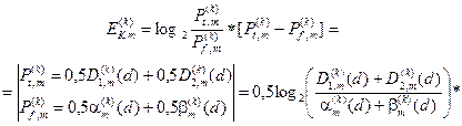апостеріорна (умовна) ентропія, що характеризує залишкову невизначеність після Для двохальтернативної системи оцінок (М = 2) і рівноймовірних гіпотез, що характеризує найбільш важкий у статистичному сенсі випадок прийняття рішень, після відповідної підстановки ентропій (2.7.2) і (2.7.3) у вираз (2.7.1) та заміни відповідних апостеріорних ймовірностей на апріорні за формулою Байєса [46] ентропійний критерій набирає вигляду