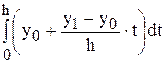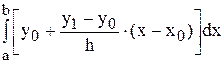 4.6.1. Вывод формулы. Пусть функция f(x) интерполируется на [a, b] многочленом 1-й степени: F(x) = P1 (x) = y0 + (х – x0) ×D1[x0, x1], где x0 = a, x1= b. Обозначим h = x1–x0. Или I*= Сделаем замену переменных t = x – x0, получим I*= После интегрирования и преобразования получим следующую формулу:
