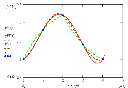 Замечание. Подобный подход также имеет недостатки, главным из которых является негладкость интерполяционных кривых в точках “стыковки” отдельных многочленов. Данный недостаток может быть преодолен использованием так называемой сплайн-аппроксимации, при которой параметры многочленов подбираются из условия гладкости сочленения (совпадения первых производных) отдельных звеньев (сплайнов) в точках “склеивания”. Подобная интерполяция используется при решении многих задач, в частности, в компьютерной графике и машиностроении при построении линий сложной формы. На рис. 4.7 приведены графики различных видов интерполяции.