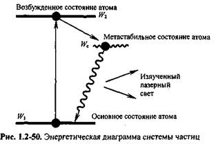 где h — постоянная Планка, Дж Данная формула выражает закон сохранения энергии при взаимодействии фотонов с микрочастицами: переходы между состояниями микрочастиц происходят только при взаимодействии с фотонами резонансной частоты. Процесс получения света представлен на энергетической диаграмме системы частиц (рис. 1.2-50). Между двумя энергетическими уровнями W\ и W2 возможны 3 типа оптических процессов: - спонтанное (самопроизвольное) излучение, - поглощение, - индуцированное (вынужденное) излучение. Лазер работает по трехуровневой схеме ОКГ, отражающей состояние атома: Wx — Wc — W2. Нижний уровень (W\) соответствует основному состоянию атомов в электромагнитном поле. Находящиеся в состоянии покоя атомы этого уровня, возбуждаются под действием испускаемых импульсной лампой фотонов и переходят на более высокий энергетический уровень (Wj). Верхний уровень (W2) соответствует возбужденному состоянию атомов, переход которых снова в основное состояние происходит не сразу, а через промежуточное состояние. Средний уровень (Wc) соответствует метастабильному состоянию атомов, который является определяющим в работе лазера. Атомы находятся в этом состоянии до тех пор, пока не возникнут условия для перехода. При переходе испускается фотон с длиной волны света, а лавинообразное нарастание интенсивности в активной среде обеспечивает усиление лазерного света.