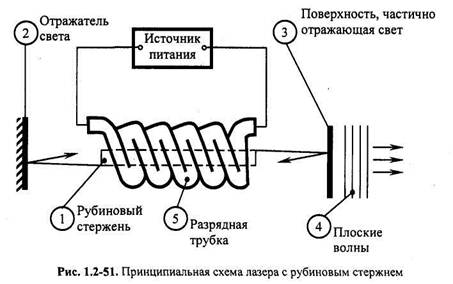 Принцип работы лазера можно рассмотреть на примере его конструкции (рис. 1.2-51) с применением рубинового стержня. Основными элементами лазера являются рубиновый стержень (1), разрядная трубка (5) и отражатели (2, 3).
