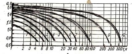 По кривой, которая пошла бы между кривыми 5 и 6, получаем Uk=1.12 В. Разрядный тока равен 50 мА 3. Определяем начальное напряжение элемента (значение U на осе ординат)