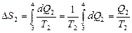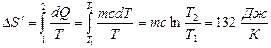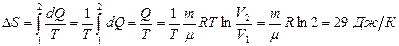 Пример 3.4.7. Найти изменение энтропии при нагревании 100 г воды от 00С до 1000С и последующим превращением воды в пар той же температуры. Решение: Найдем отдельно изменение энтропии При бесконечно малом изменении Во время превращения воды в пар при той же температуре Пример 3.4.8. Теплоизолированный сосуд разделен на две равные части перегородкой, в которой имеется закрывающееся отверстие. В одной половине сосуда содержится 10 г водорода. Вторая половина откачана до высокого вакуума. Отверстие в перегородке открывают, и газ заполняет весь объем. Считая газ идеальным, найти приращение его энтропии. Решение: Расширение газа здесь является необратимым процессом. Поэтому нельзя применять формулу Т.к. данный газ изолирован от окружающей среды Пример 3.4.9. Исходя из второго начала термодинамики, вывести формулу для к.п.д. цикла Карно. Решение: Т.к. цикл Карно – обратимый процесс, то полное изменение энтропии изолированной системы нагреватель - рабочее вещество – холодильник равно нулю: