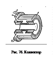Главный полюс состоит из сердечника, набранного из листовой стали, и укрепляется болтами к станине. Вокруг главного полюса намотана полюсная обмотка. Свободный конец полюса имеет наконечник, обеспечивающий требуемое распределение магнитного поля. Станина называется ярмом машины, через нее замыкаются цепи главного магнитного потока Ф. Она изготавливается из литой стали, так как магнитный поток в ней относительно постоянен. Дополнительные полюсы установлены между основными полюсами. Их обмотки соединяются последовательно с якорем. Якорем называется часть машины, в обмотке которой при вращении ее относительно главного магнитного поля индуцируется ЭДС (см. рис. 75). Якорь состоит из зубчатого сердечника, в пазах которого уложены обмотки, и коллектора, насаженного на вал якоря, но изолированного от вала. Сердечник выполняется из листов электротехнической стали, изолированных друг от друга лаком.