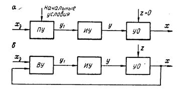Управление, оптимальное по быстродействию, может быть осуществлено как в разомкнутых, так и в замкнутых системах. Разомкнутые системы (рис. 6.3, а) применяются в тех случаях, когда возмущающие воздействия на объект либо отсутствуют, либо заранее известны (в виде функций времени). Разомкнутая система содержит программное устройство ПУ, которое после пусковой команды выдает заранее рассчитанную программу изменения управляющего воздействия. Причем в устройство может быть заложено несколько программ, оптимальных для различных начальных, состояний объекта. В замкнутых системах (рис. 6.3, б) оптимальное по быстродействию управление осуществляется при помощи включенного в контур вычислительного устройства ВУ. В это устройство вводятся текущие значения фазовых координат объекта, благодаря чему обеспечивается управление, оптимальное при различных внешних воздействиях.