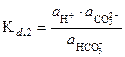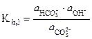 где K h, 1 - константа гидролиза карбонат-иона по первой ступени, K w - ионное произведение воды, равное 10-14 при 298 К, K d, 2 - константа диссоциации угольной кислоты по второй ступени. 2-ая ступень гидролиза: НСО3- + Н2О Û Н2СО3 + ОН-;
