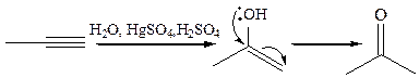 Дестабилизирующее влияние атома галогена в карбкатионе (а) ослаблено за счет +М-эффекта. Атом галогена своей НЭП р -электронов участвует в делокализации "+" заряда. Вследствие большей стабильности карбокатион (а) образуется быстрее и его взаимодействие с нуклеофилом приводит к получению геминального дигалогенпроизводного. 1.1.4 Гидратация (реакция М.Г. Кучерова, 1881 г.):