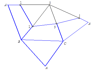 Развертка боковой поверхности пирамиды (рис. 16.3) состоит из трех треугольников, представляющих в истинном виде боковые грани пирамиды. Для построения развертки необходимо предварительно определить истинные длины боковых ребер пирамиды. Повернув эти ребра вокруг высоты пирамиды до положения параллельного плоскости p2, на фронтальной плоскости проекций получим их истинные длины в виде отрезков Построив по трем сторонам Для получения полной развертки к одной из сторон основания пристраиваем основание пирамиды – треугольник АВС. Для построения на развертке линии, по которой поверхность пирамиды пересечется плоскостью a (рис. 16.3), надлежит нанести на ребра SA, SB и SC, соответственно, точки 1, 2 и 3, в которых эта плоскость пересекает ребра, определив истинные длины отрезков S1, S2 и S3.