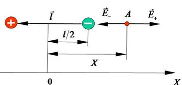 - Электрическое поле в точке А складывается из полей заряда q+ и q-. Согласно принципа суперпозиции имеем: