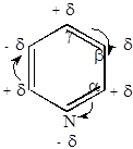 Химические свойства пиридина сходны со свойствами бензола. Проявляет ароматические свойства (более ярко выраженные, чем у пятичленных гетероциклов), однако распределение электронной плотности в пиридине не вполне равномерное, он проявляет ненасыщенность в большей степени, чем бензол (но меньше, чем тиофен). Это вытекает из электронного строения пиридина. В кольце пиридина 3 двойные связи, 6