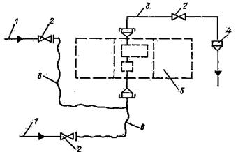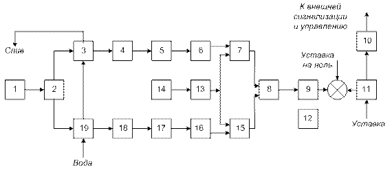 Рис. 7.5. Схема гидравлических соединений сигнализатора. / — магистраль от пробоотборника; 2 — вентиль; 3 — трубка диаметром 6 мм; 4 — воронка; 5 — фотометрический блок; 6 — гибкий шланг для промывки сигнализатора; 7 — патрубок для подачи питьевой воды; 8 — соединительный гибкий шланг. Элементы оптической схемы закрыты двумя литыми герметичными крышками, имеющими оптические окна со стеклами, и образуют отсек осветителя и отсек светоприемников, между которыми расположена съемная кювета. Элементы электрической схемы закрыты герметичной крышкой, которая образует электронный отсек. Крышки крепятся к панели винтами. В чем отличие модернизированных сигналлзаторов СНС-201? В новой модификации сигнализатора автомобильная лампа заменена твердым излучателем, изменены схемы для обеспечения визуальной индикации при регулировке и настройке, также реализована автоматическая диагностика неисправностей. Модернизация позволяет в два раза уменьшить массу и габариты сигнализатора и в пять раз уменьшить потребляемую мощность. 7.8.8. В какой последовательности производится регулировка сигнализатора? Сигнализатор настраивается ирегулируется на предприятии-изготовителе и при соблюдении правил перевозки, хранения и установки не нуждается в дополнительной регулировке. Однако перед первым запуском в работу необходимо убедиться в том, что регулировка его не нарушена. Сначала проверяют чистоту наружных поверхностей оптических стекол в крышках отсеков осветителя и светоприемника, а также чистоту стекол кюветы. Если стекла загрязнены, их протирают сухой мягкой чистой тряпкой. Проверка регулировки осуществляется следующим образом. Сигнализатор включают и прогревают в течение 20 мин. В кювету заливают чистую питьевую воду. К разъему «Контроль» подключают измерительный прибор для измерения напряжения постоянного тока до 0,5 В с входным сопротивлением не менее 30 кОм. В крайних положениях потенциометра «Установка нуля» напряжение на разъеме «Контроль» должно быть порядка +70 мВ и —290 мВ. Потенциометр настраивают на нулевое показание. В держатель устанавливают двойной калибровочный светофильтр. Напряжение на разъеме «Контроль» должно составлять 70 ± 5 мВ. Если указанные выше условия не выполняются, то нужно снять заглушку с отверстий на задней крышке блока фотометра и соответствующим образом подстроить потенциометры «Измерение» и «Сравнение». Затем отрегулировать потенциометр «Порог». Если в каком-либо его положении срабатывает сигнализация, регулировка сигнализатора считается законченной.
