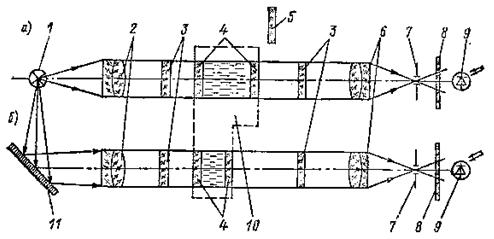 Как действует оптическая схема блока фотометра? Оптическая схема блока фотометра (рис. 7.8.6.) состоит из двух каналов: рабочего и сравнительного. В рабочем канале световой поток от источника света 1, пройдя через объектив 2, стекла крышек фотометра 3, стекла кюветы 4, нефтесодержащую воду в кювете 10, объектив 6, диафрагму 7 и интерференционный светофильтр 8, попадает на фотоприемник 9. Сравнительный оптический канал построен аналогично, добавляется лишь зеркало 11. Объективы 2 служат для формирования параллельных потоков света, проходящих через окно в стенке 5, а объективы 6 обеспечивают прохождение перекрещивающихся световых потоков в щели диафрагм, которые защищают фотоприемники от постороннего света. Интерференционные светофильтры обеспечивают пропускание излучения заданной длины волны (660 мм) и независимость результатов измерения от цветности анализируемой воды. При настройке величины срабатывания сигнализатора в его рабочий оптический канал вставляется нейтральный калибровочный светофильтр.