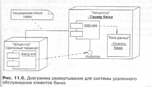 Кроме соединений на диаграмме развертывания могут присутствовать отношения зависимости между узлом и развернутыми на нем компонентами. Диаграммы развертывания могут иметь более сложную структуру, включающую вложенные компоненты, интерфейсы и другие аппаратные устройства. На изображенной ниже диаграмме развертывания (рис. 11.6) представлен фрагмент физического представления системы удаленного обслуживания клиентов банка. Узлами этой системы являются удаленный терминал