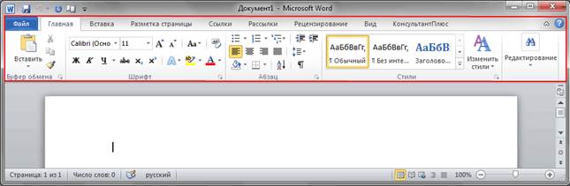 Лента включает в себя набор кнопок и команд, с помощью которых выполняются различные действия над документом и его содержимым (например, изменение размера текста или его печать). Само окно документа, выглядит, как обычный белый лист бумаги и предназначено для ввода всевозможной тестовой информации. Так же над лентой слева размещается меню быстрого запуска, посередине – название документа, а в правом верхнем углу располагаются кнопки свёртывания, изменения размера и закрытия окна программы. В открывшемся документе в верхнем левом углу страницы вы увидите курсор, то есть небольшую мигающую вертикальную черту. Данная черта указывает на то, что, начиная с данного места, будут появляться введенные вами символы.