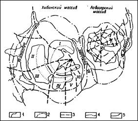 Рис.4.1 Схема тектонических разломов Хибинского и Ловозерского массивов. 1 - границы массивов; 2 - кольцевые разломы; 3 - радиальные разломы; 4 - границы породных комплексов; 5 - рудные тела.