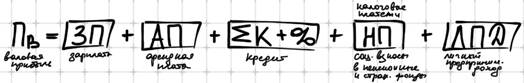 Как правило, крупные промышленные фирмы не могут создавать свою продукцию без дополнительных заемных средств (кредита банков). Плата за кредитные услуги- процент (%). Кроме того процесс производства постоянно требует дополнительных территорий, транспортных средств, техники. Арендуемые земельные участки, транспорт и техника оплачиваются арендной платой (АП). Работники предприятия (рабочие и инженерно-технические работки (ИТР)) за свой труд получают заработную плату (ЗП). И наконец, государство получает от предприятия налоговые платежи (НП) и социальные взносы (Соц. взнос), идущие в пенсионный и страховые фонды. Оставшаяся часть средств валовой прибыли поступает в личный предпринимательский доход.