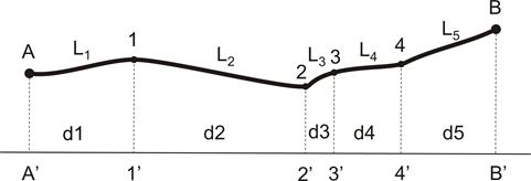 Линейные измерения долгое время оставались наиболее трудоемкой частью полевых работ при производстве геодезических измерений. Сложность состояла в том, что земная поверхность между геодезическими точками не является горизонтальной плоскостью. Напротив, эта поверхность может быть сильно пересеченной. В створе между точками могут быть холмы и впадины, овраги, ручьи, реки, кустарники, лесопосадки, отдельные деревья и прочее. Поэтому измерения длин линий в таких условиях выполняется по частям (рис. 3).