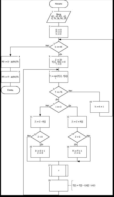 Назовем состояние, в котором обычно находится система, обычным состоянием. Такие состояния интереса не представляют, хотя занимают большую часть времени. Особые состояния — это такие состояния в изолированные моменты времени, в которых характеристики системы изменяются скачкообразно. Для изменения состояния системы нужна определенная причина, например, приход очередного входного сигнала. Ясно, что с точки зрения моделирования интерес представляет именно изменение характеристик системы, то есть принцип требует от нас отслеживать моменты перехода системы из одного особого состояния в другое. По сравнению с предыдущим случаем, мы не будем проверять изменение состояния системы в каждый момент времени. Выберем среди будущих моментов только те, в которые происходит поступление или уход изделий со склада, ближайший к текущему моменту времени (блок 7 — здесь и далее см. блоки на рис. 32.3). Определив такой момент, сразу перейдем в него скачком, изменив значение счетчика времени на величину (–Ln(r)/ λi) (блок 18). В остальном, алгоритм похож на предыдущий. Заметим только, что цикл опроса входных сигналов ликвидирован, поскольку блок 7 четко отвечает на вопрос, какой из i-тых сигналов имел место. Все это существенно экономит время моделирования. Блок-схема алгоритма показана на рис. 32.3.