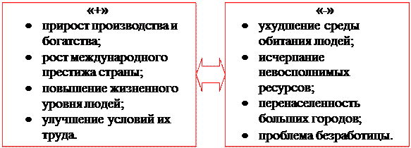 Экономическое развитие общества представляет многофакторный динамический процесс, который рассматривается только за средне- и долгосрочные периоды времени. Поэтому экономический рост – одна из центральных экономических проблем, стоящих перед всеми странами. По его динамике судят о развитии национальных экономик, о жизненном уровне населения, о том, как решаются проблемы ограниченности ресурсов. Экономический рост – это увеличение объемов национального производства, которое происходит на основе расширения объемов используемых ресурсов и/или совершенствования техники и технологий. Не смотря на огромную значимость экономического роста, этот процесс имеет свои плюсы и минусы (схема 51). Схема 51. Последствия экономического роста