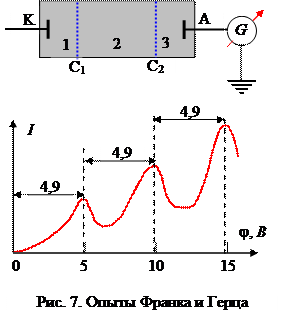 Получено прямое экспериментальное доказательство существования стационарных состояний атома и квантования энергии. Метод задерживающего потенциала, вакуумная трубка с парами ртути (Р = 13 Па); С1, С2 - ускоряющая и задерживающая сетки. Подтверждение 1-го постулата: электроны передают энергию порциями с наименьшим квантом 4,9 эВ. Подтверждение 2-го постулата: атомы ртути, получив энергию D Е, должны излучать квант с частотой
