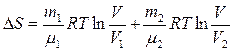 Вновь рассмотрим сосуд объемом V, разделенный перегородкой на две части, но пусть теперь они заполнены разными газами, находящимися в состоянии термодинамического равновесия, между которыми тоже существует термодинамическое равновесие, то есть температуры и давления в обеих частях сосуда одинаковы. Если убрать перегородку, происходит диффузия до нового равновесного состояния, в котором распределение молекул обоих газов равномерно, так как предполагается отсутствие внешних полей. Рассчитаем изменение энтропии в этом процессе. Данный процесс можно рассматривать как расширение в пустоту каждого из двух газов, и изменение энтропии определить как сумму изменений энтропии в каждом из этой процессов: