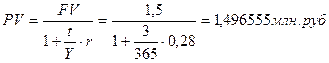 На практике подобные расчеты встречаются не часто. Например, для определения суммы капитала, которую нужно инвестировать под определенные проценты, чтобы получить требуемую сумму денег, а также чтобы начислить проценты, удерживаемые вперед при выдаче ссуды. Пример 5. Ставка размещения краткосрочных денежных ресурсов для банков на 3 суток составляет 28% годовых. Какой объем средств необходимо разместить, чтобы в результате операции поступило 1,5 млн руб. (точные проценты).